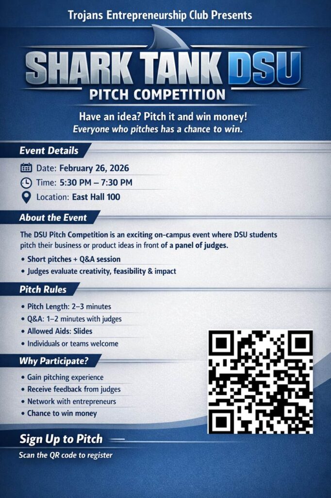 The event is organized by the Trojans Entrepreneurship Club, which aims to encourage leadership, innovation, and business development across campus. By hosting events like Shark Tank DSU, the club hopes to build a stronger entrepreneurial culture at DSU.
